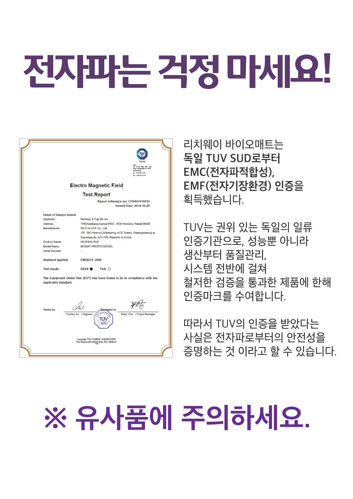 더불어 유해 전자파를 차단하기 위하여 3단계로 설계되었으며 17겹의 레이어중 맨 마지막은 자수정을 탑재하여 파장을 좀더 자연 친화적인 파장으로 유도하기 위하여 사용 하였습니다, 물론 자수정 자체에서도 원적외선 파장이 발생 됩니다, 그리고 개발 후 원적외선의 파장을 정밀하게 측정하였고 다양한 실험 과정을 거쳐 수정과 보완 과정을 거쳐 리치웨이 바이오매트가 탄생하게 되었습니다,